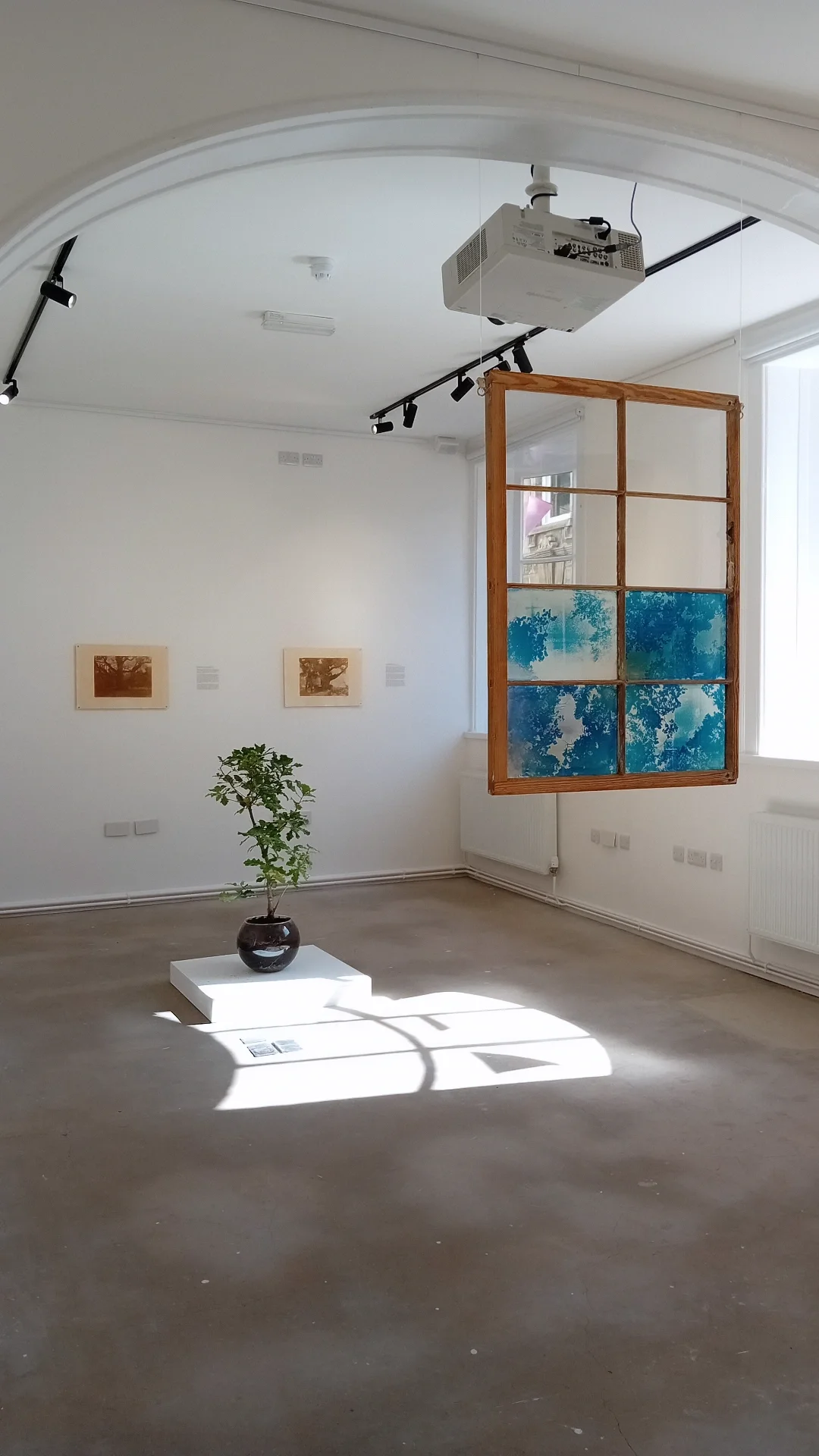 Photograph detailing sunlit elements of ‘These Rooted Bodies’, a solo exhibition at RidgeBank Contemporary Art Space, 8th Aug - 26th Sept 2025. This exhibition brought together new work as part of the project’s expanded practice, including To tilt the neck, to touch the crown, a series of cyanotype glass plates set into a restored Georgian window.
